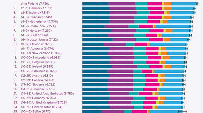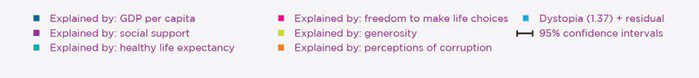 Given the events in the Middle East, it may be surprising to see Israel so high up in the chart, but this may be due to the time lag. This report does attempt to explain differences via various regression analyses, including country level factors such as: GDP per capita, social support, healthy life expectancy at birth, freedom to make life choices, generosity, perceptions of corruption.