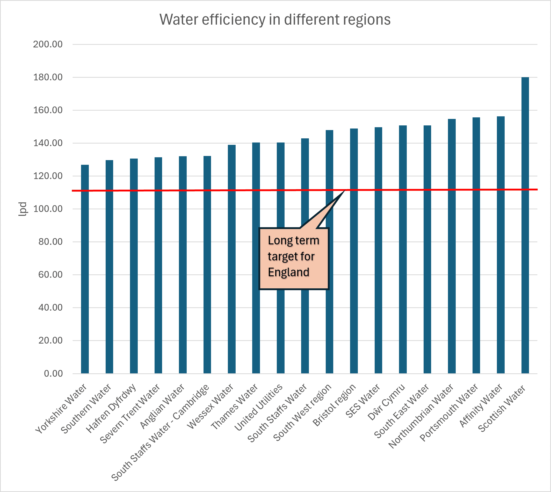 The chart below shows recent data from Ofwat [1]. According to this dataset the best region for water efficiency appears to be Yorkshire, while Scotland looks to be the worst. The unit of measurement used for this comparison is “litres per person per day” (lpd). A key takeaway from the data is that all regions are currently performing worse than the long-term English target of 110 lpd [2]. This target was set with future climate and population changes in mind.